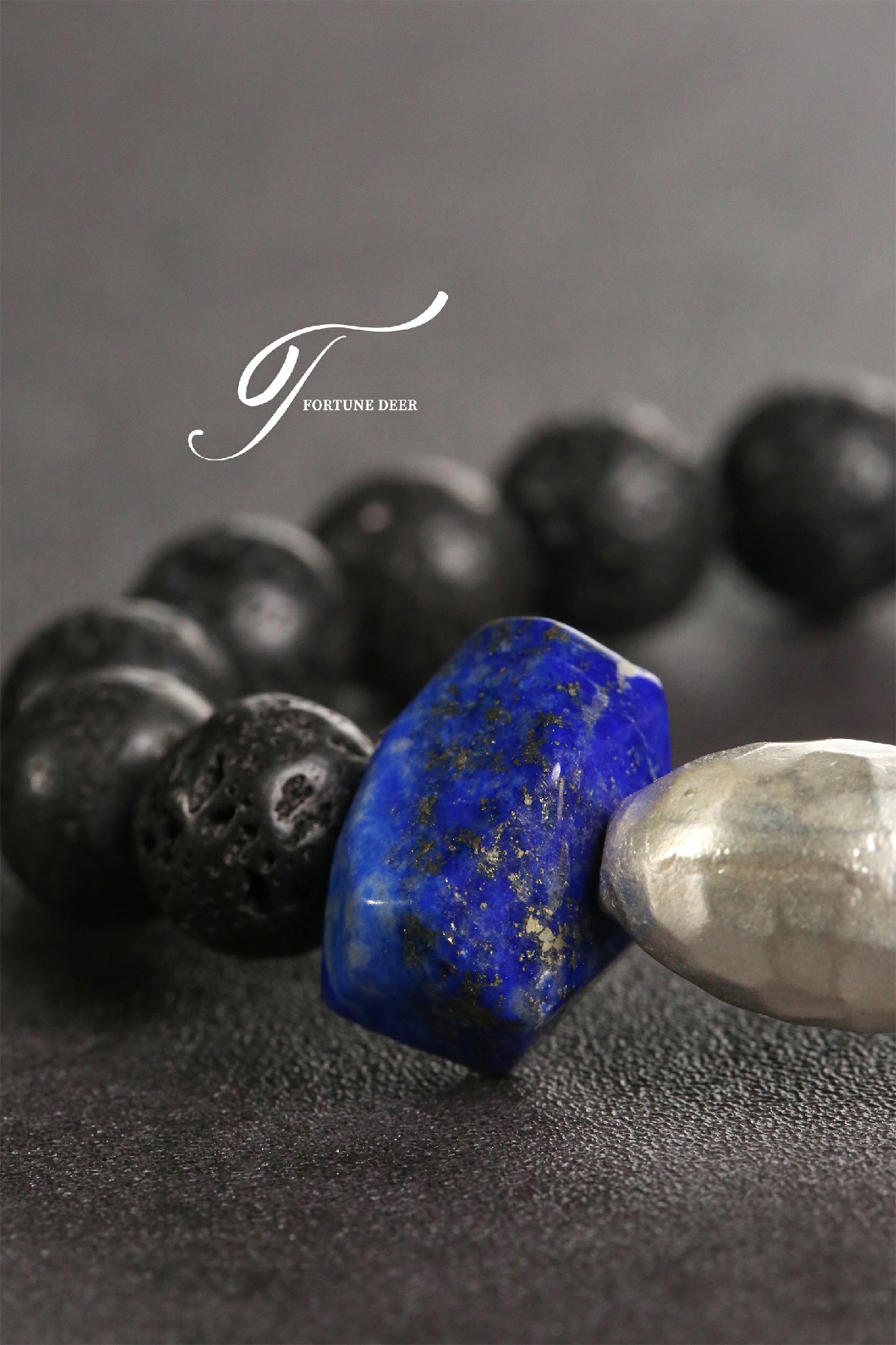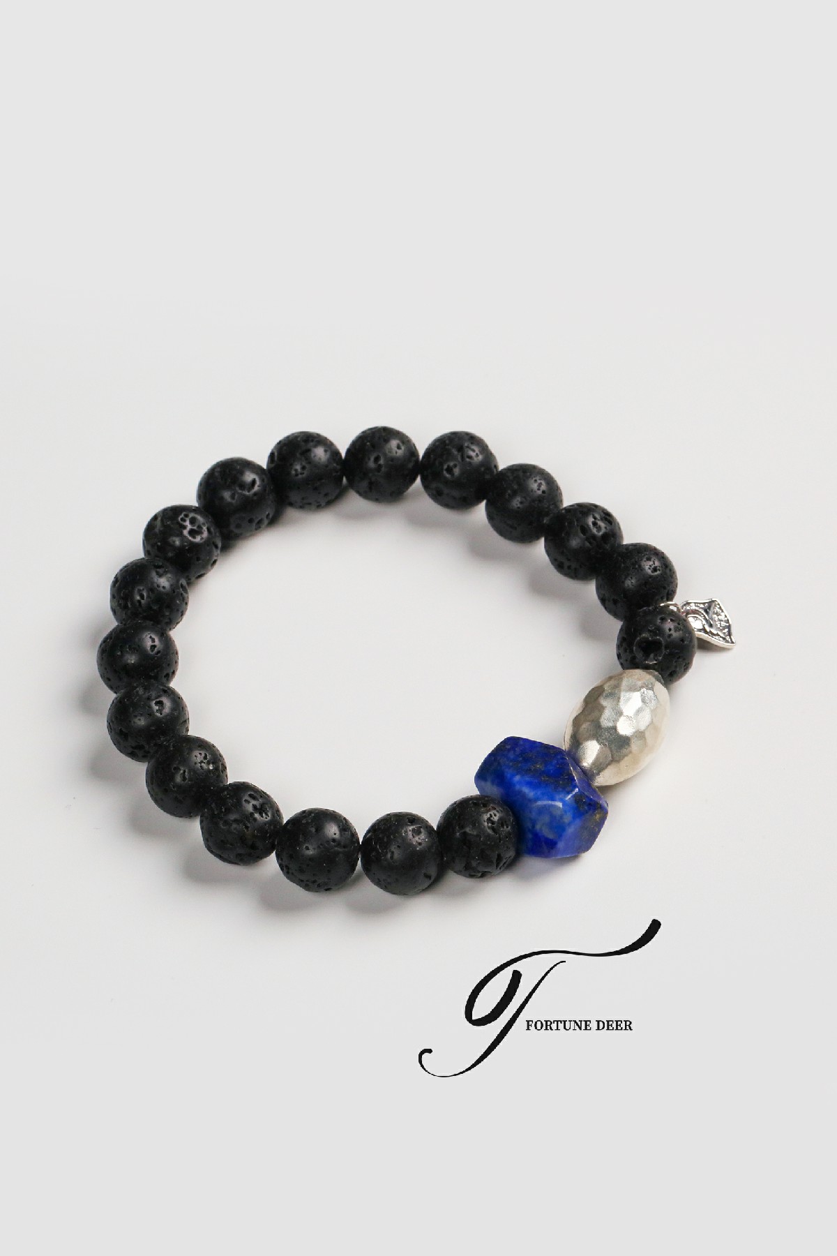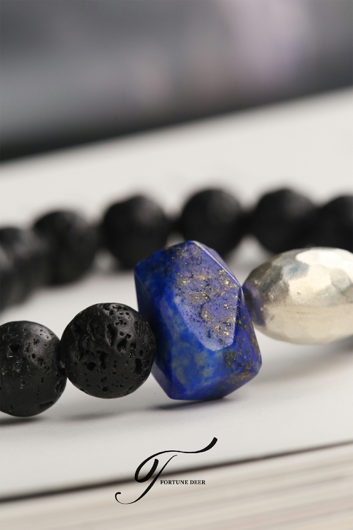 Crafted from meteorite and lapis lazuli, this bracelet channels cosmic energy and ancient wisdom. The textured lava beads provide grounding, while the deep blue lapis lazuli promotes inner truth and spiritual clarity. A silver charm symbolizing protection enhances the design, offering strength and guidance. Wear it to align with the universe’s energy, inviting balance, clarity, and protection into your life.