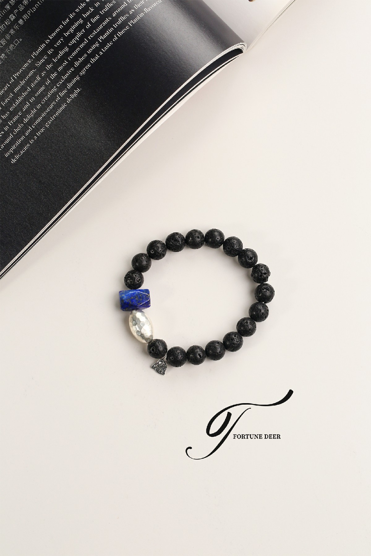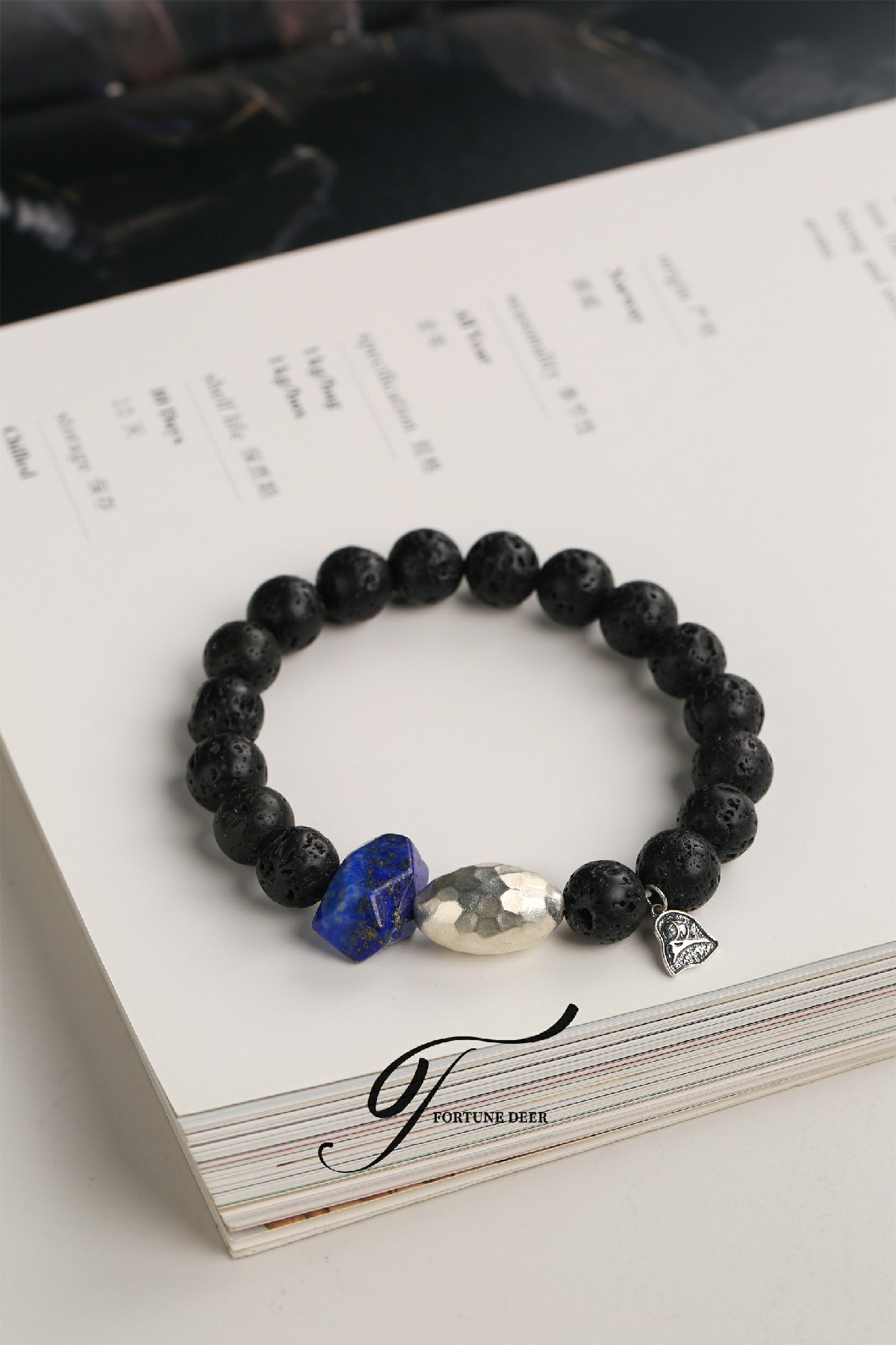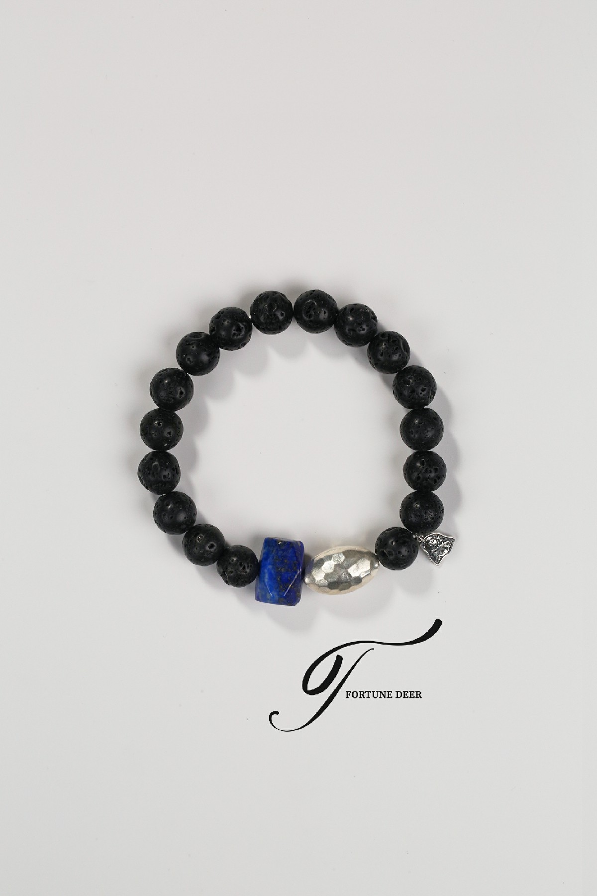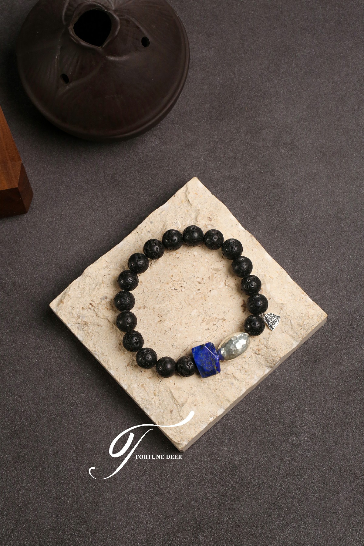 Crafted from meteorite and lapis lazuli, this bracelet channels cosmic energy and ancient wisdom. The textured lava beads provide grounding, while the deep blue lapis lazuli promotes inner truth and spiritual clarity. A silver charm symbolizing protection enhances the design, offering strength and guidance. Wear it to align with the universe’s energy, inviting balance, clarity, and protection into your life.