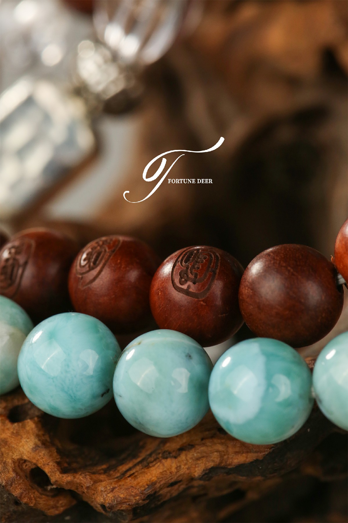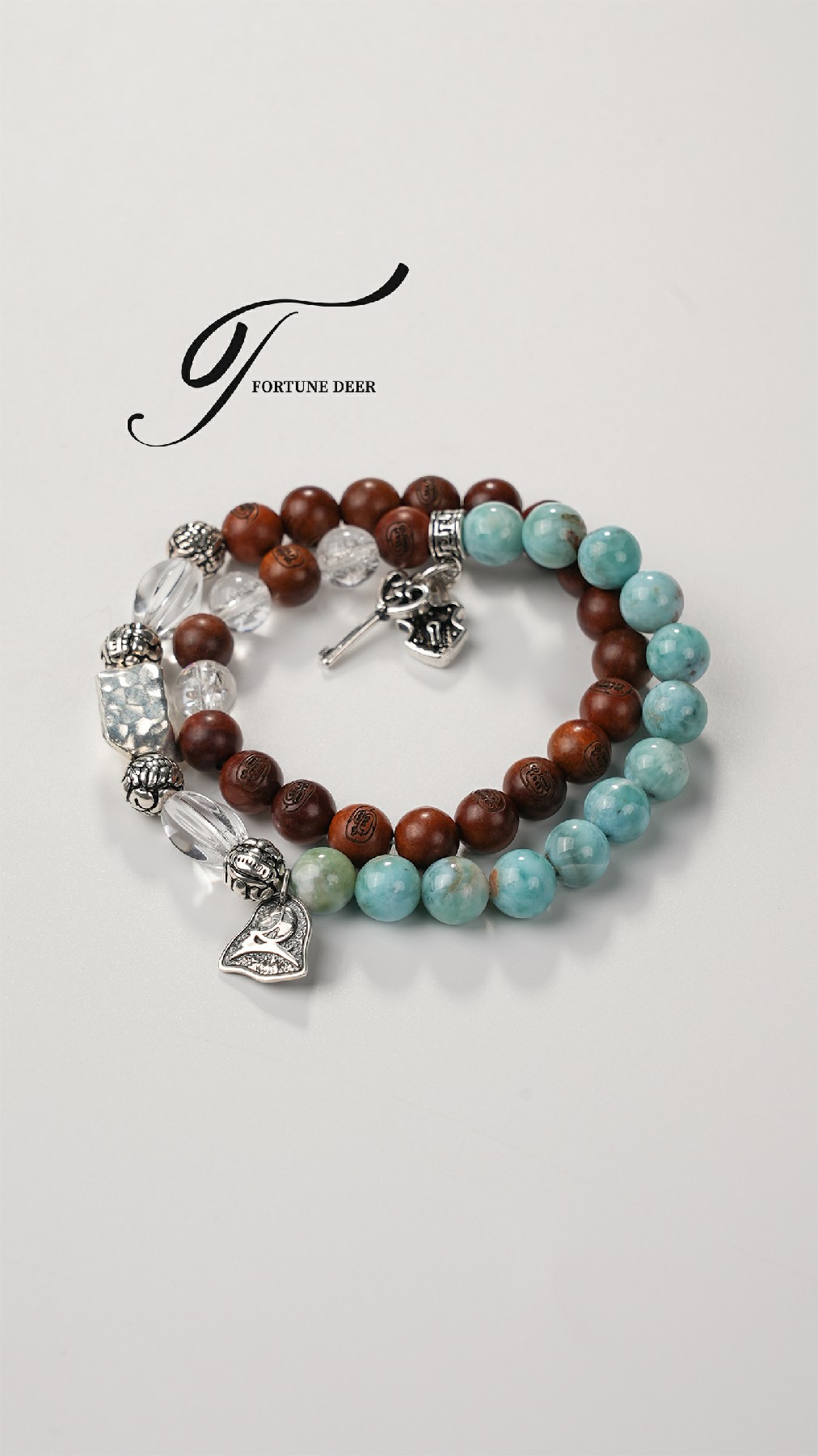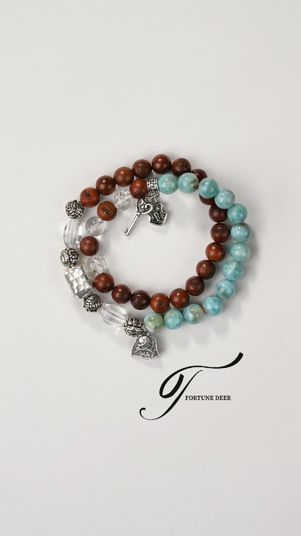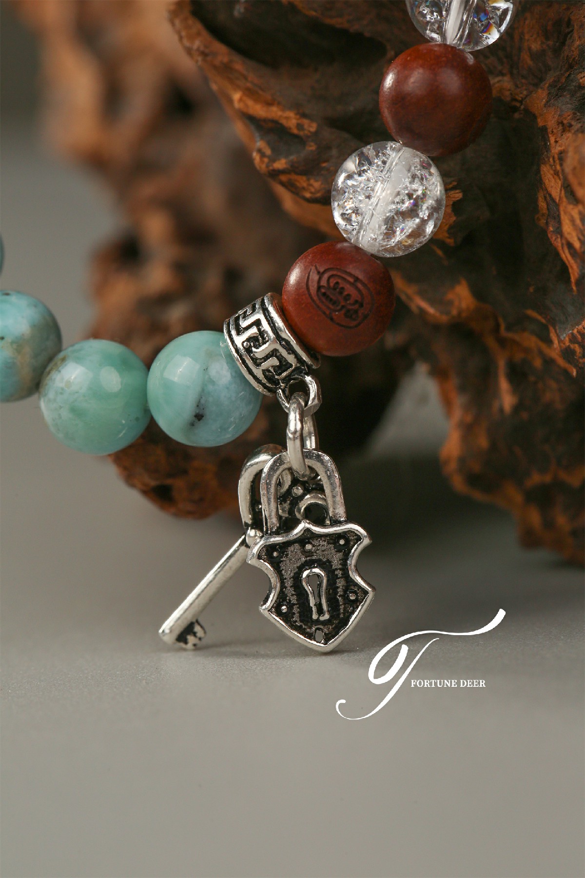 The Pathway of Fortune bracelet combines the calming energy of Larimar from the Dominican Republic with the protective power of Thunderstrike Wood, each bead engraved with the Taoist Golden Light Mantra for added spiritual strength. The design is completed with a Sterling Silver Key, symbolizing the unlocking of new opportunities. A harmonious blend of protection, serenity, and transformation, this bracelet helps guide you on your journey of growth.