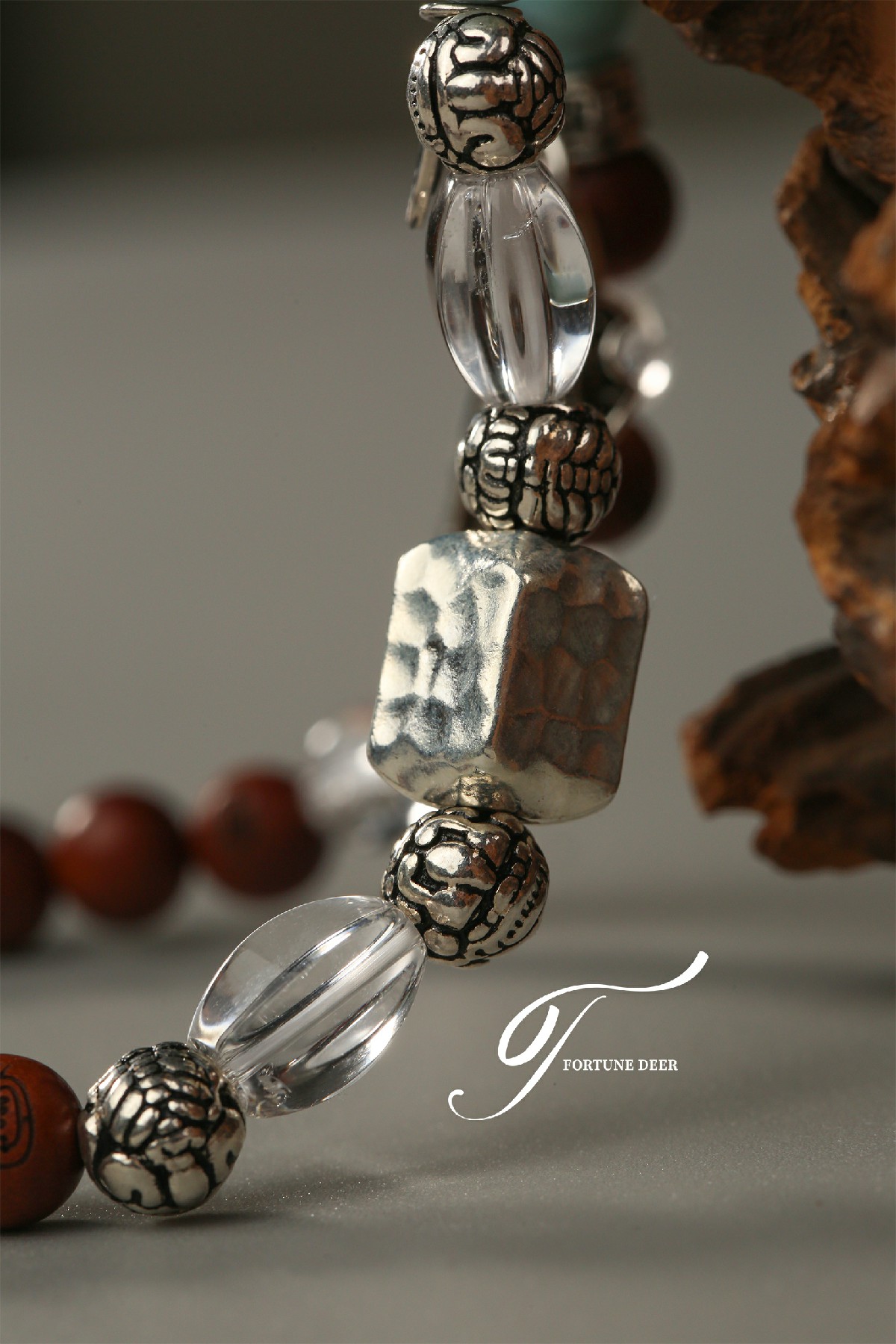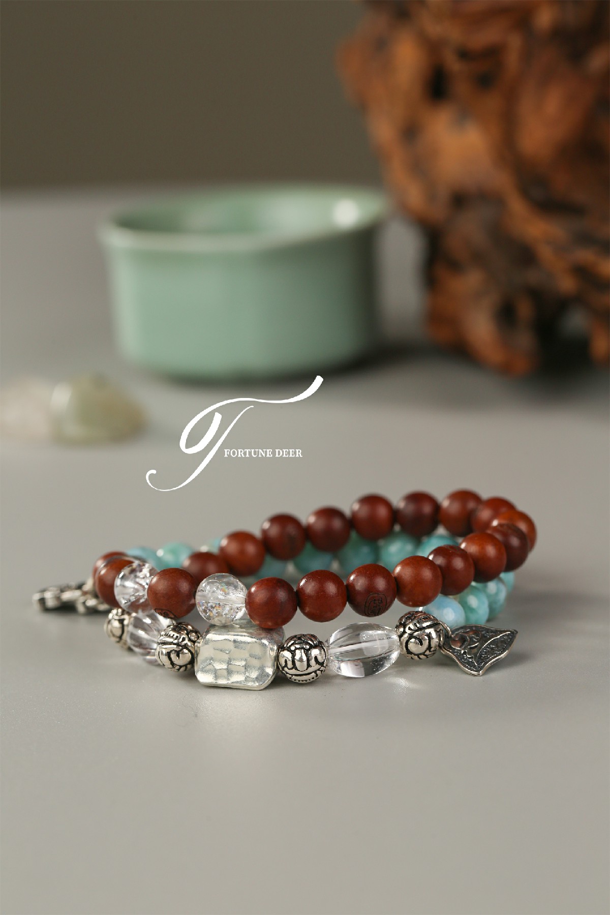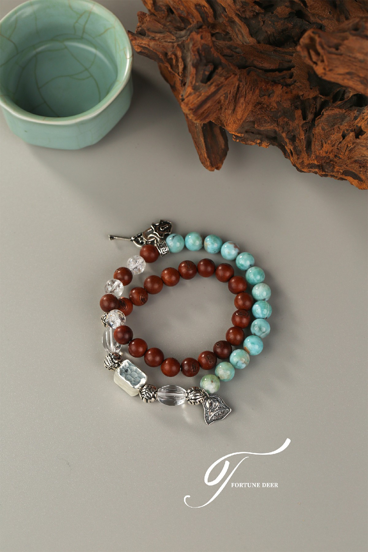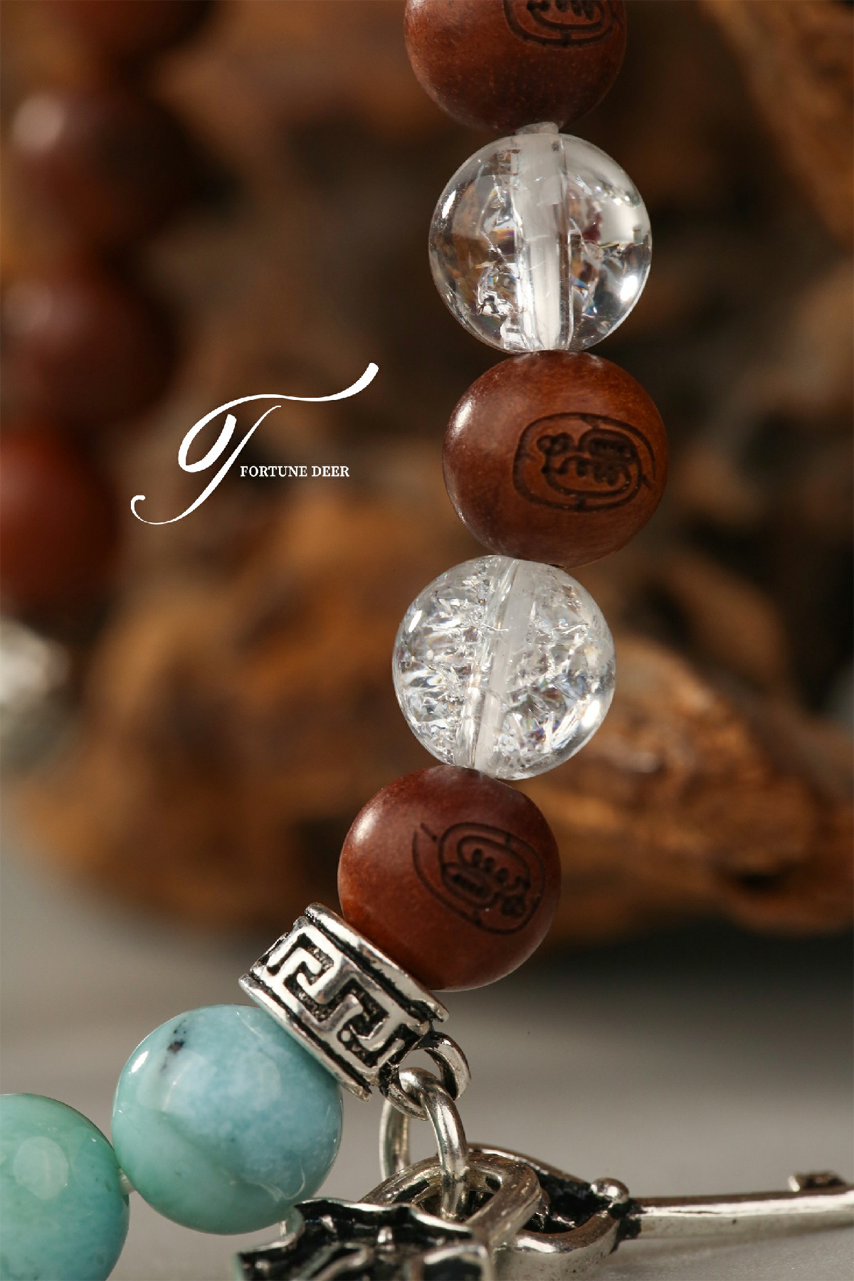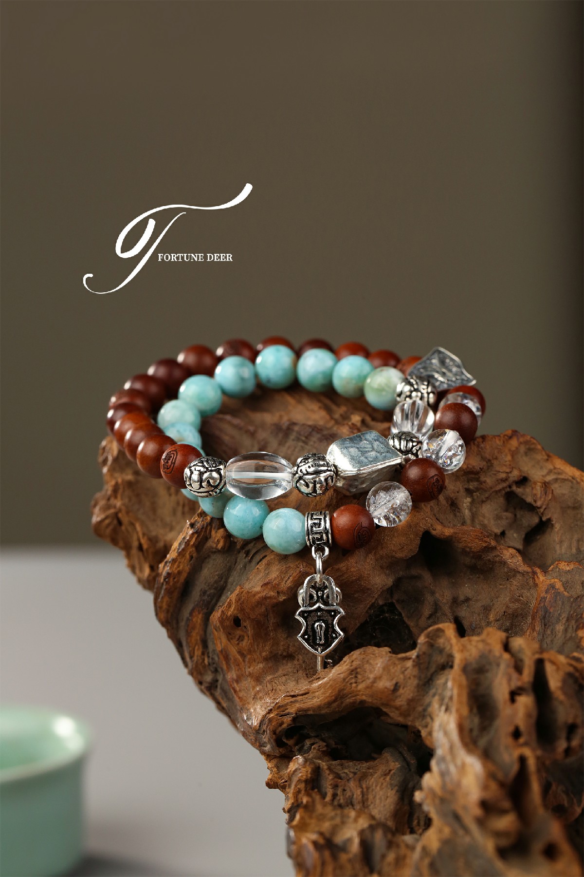 The Pathway of Fortune bracelet combines the calming energy of Larimar from the Dominican Republic with the protective power of Thunderstrike Wood, each bead engraved with the Taoist Golden Light Mantra for added spiritual strength. The design is completed with a Sterling Silver Key, symbolizing the unlocking of new opportunities. A harmonious blend of protection, serenity, and transformation, this bracelet helps guide you on your journey of growth.