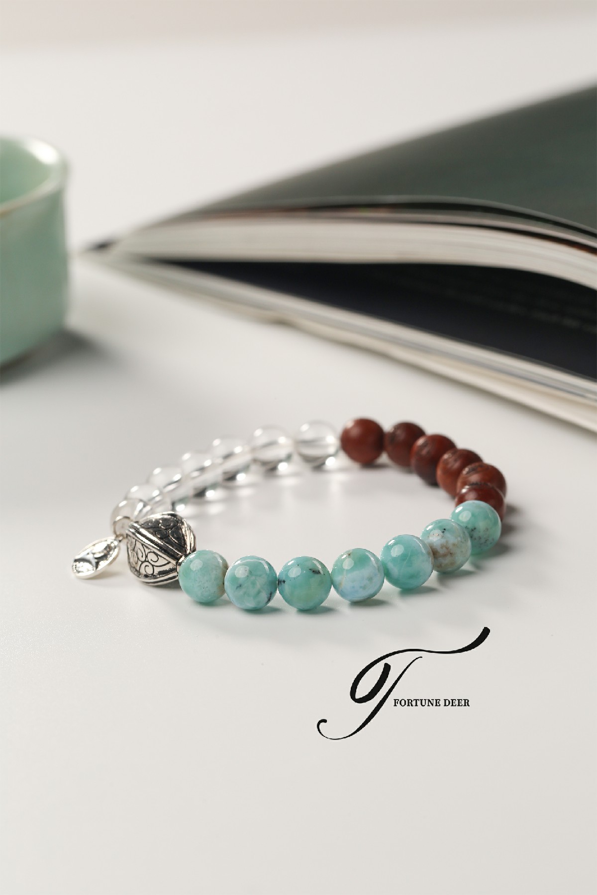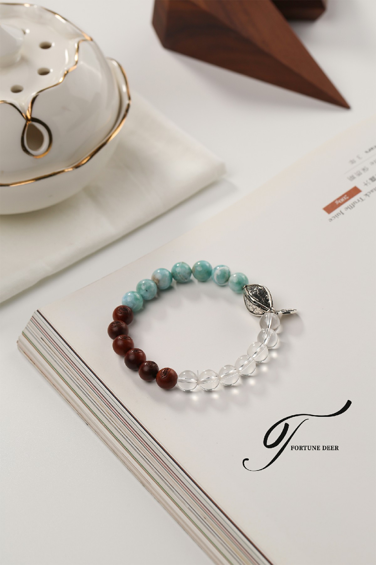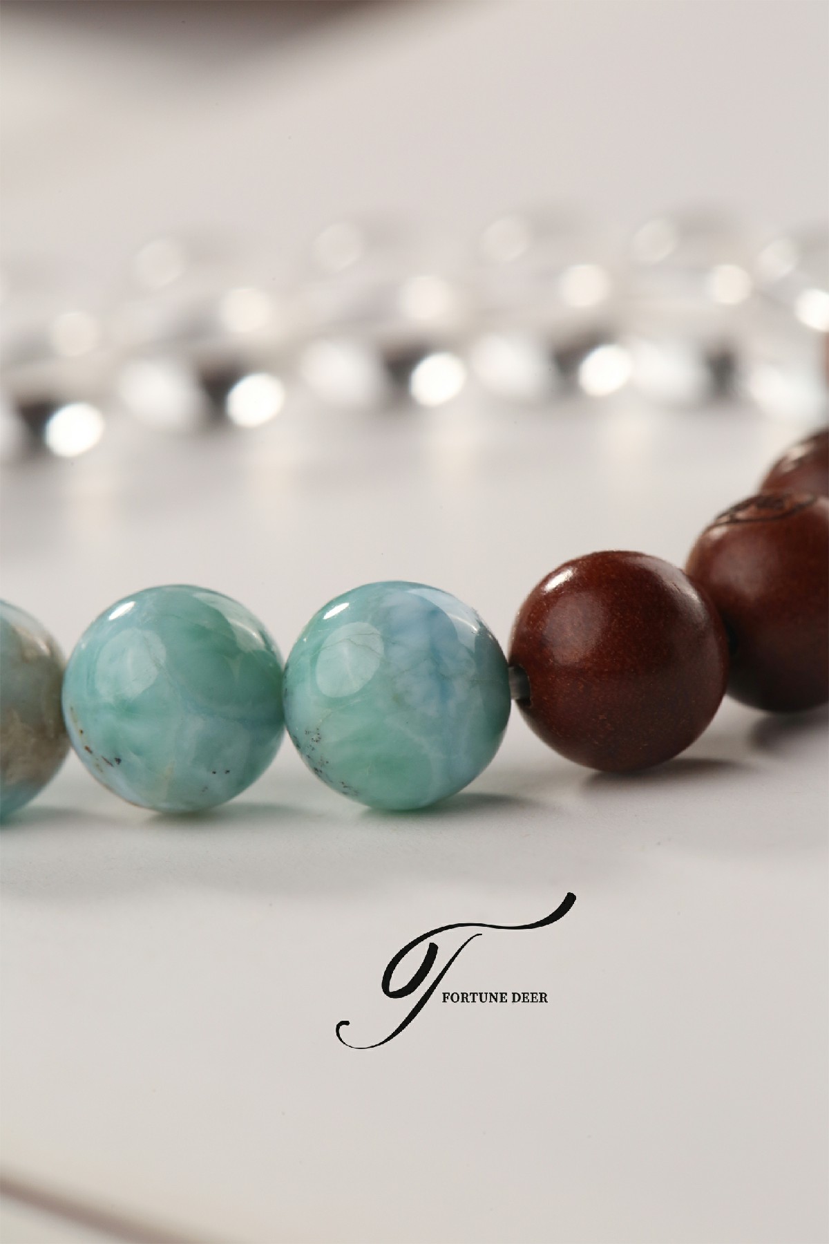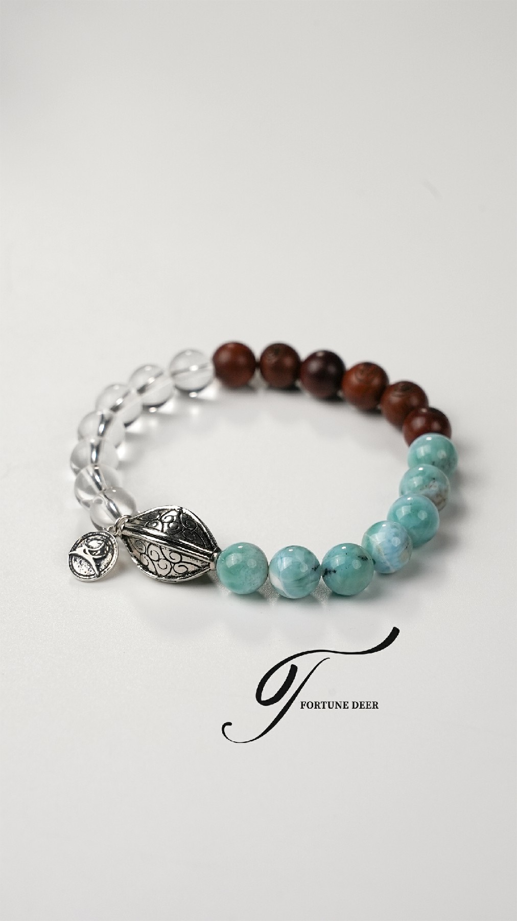The Tranquil Horizon bracelet brings together the calming energy of Larimar from the Dominican Republic and the grounding essence of Thunderstrike Wood. The bracelet features smooth White Quartz beads, known for their clarity and healing properties, and is finished with the Fortune Deer brand tag in sterling silver. This piece symbolizes balance and protection, helping you stay centered while embracing new beginnings. Wear The Tranquil Horizon to align with peace, clarity, and transformation.