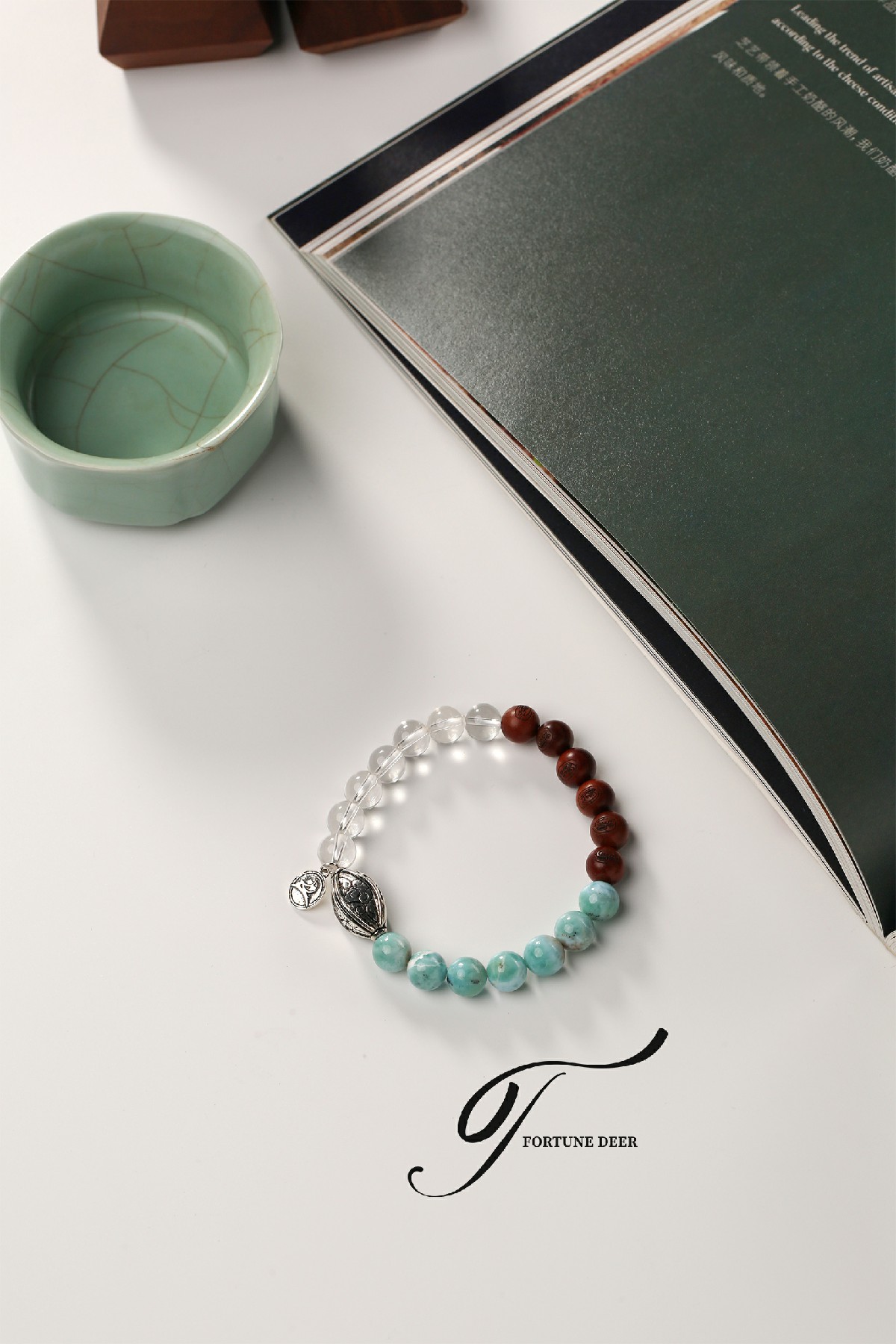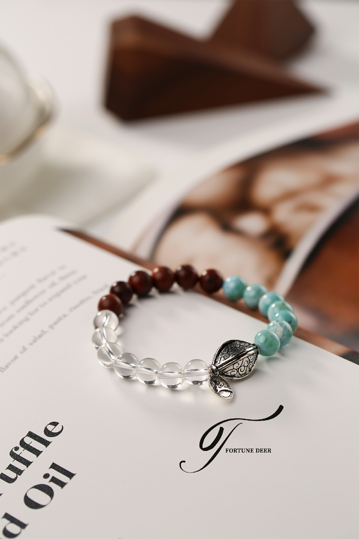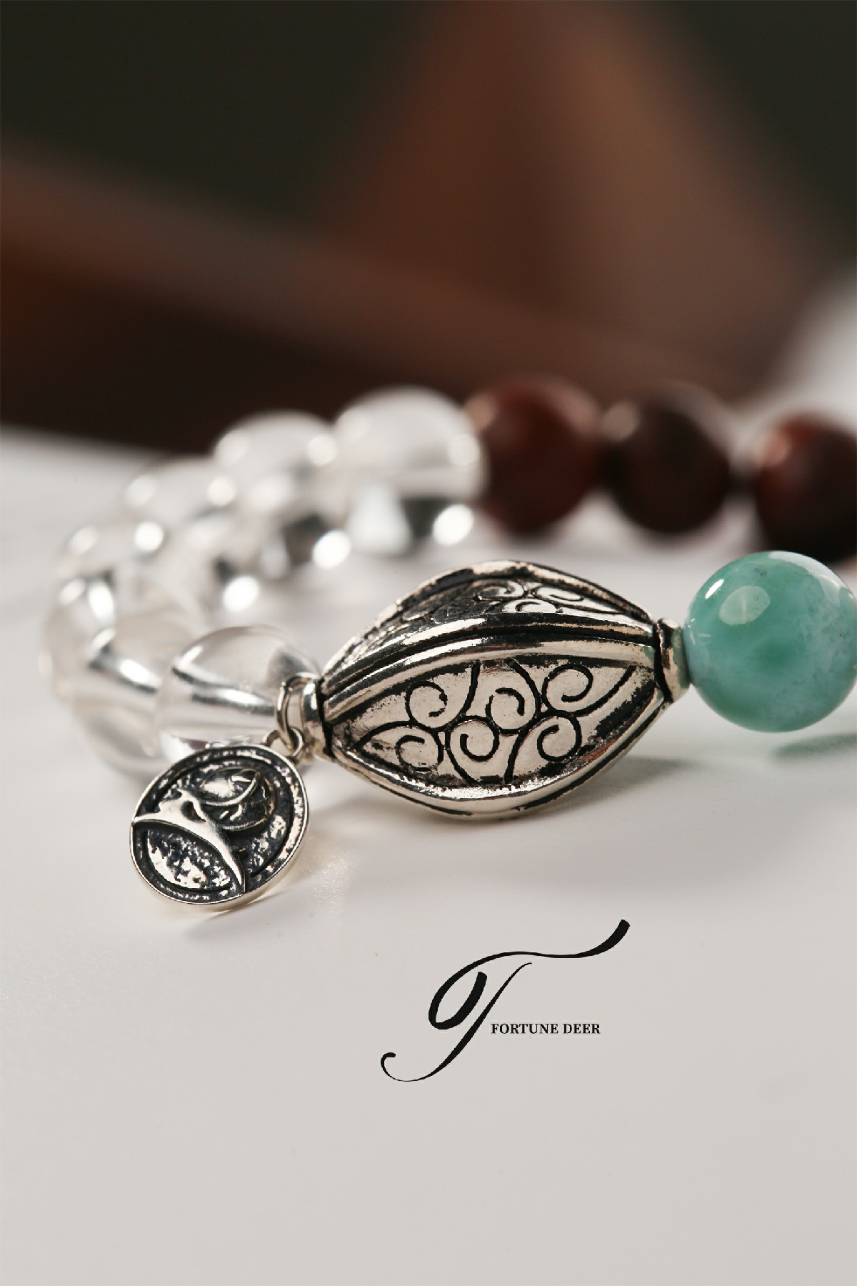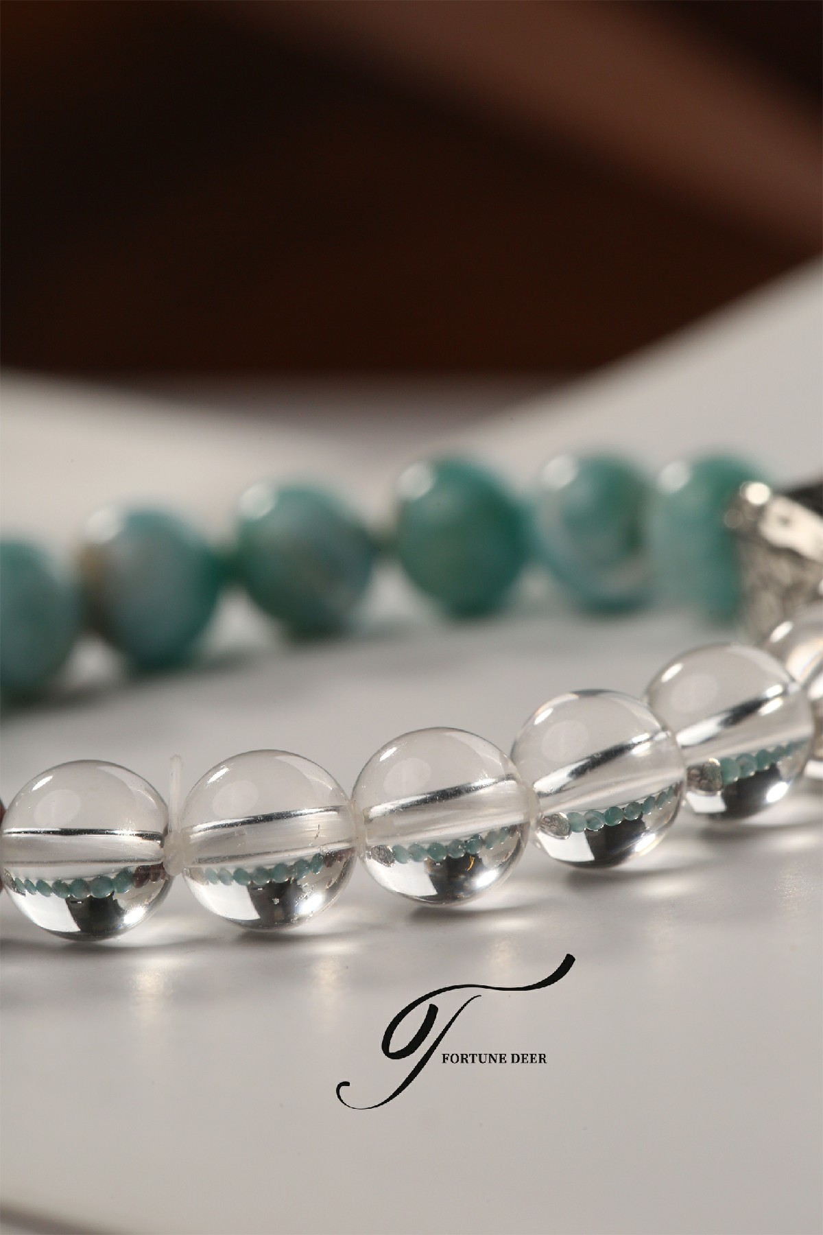The Tranquil Horizon bracelet brings together the calming energy of Larimar from the Dominican Republic and the grounding essence of Thunderstrike Wood. The bracelet features smooth White Quartz beads, known for their clarity and healing properties, and is finished with the Fortune Deer brand tag in sterling silver. This piece symbolizes balance and protection, helping you stay centered while embracing new beginnings. Wear The Tranquil Horizon to align with peace, clarity, and transformation.