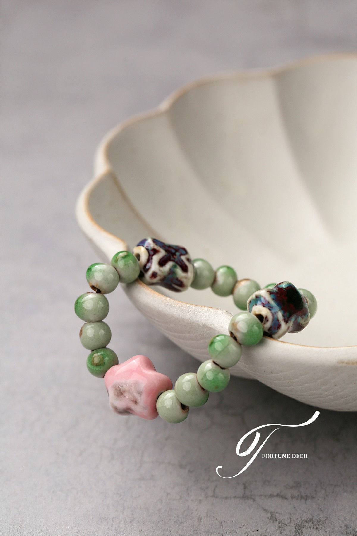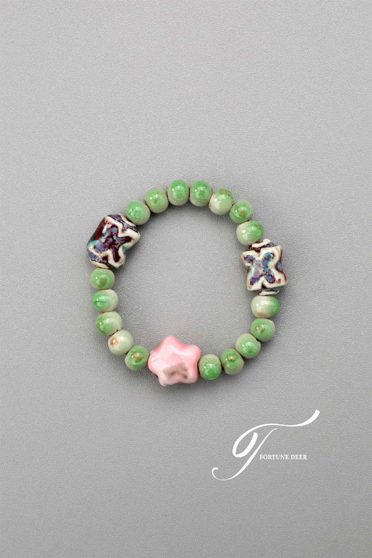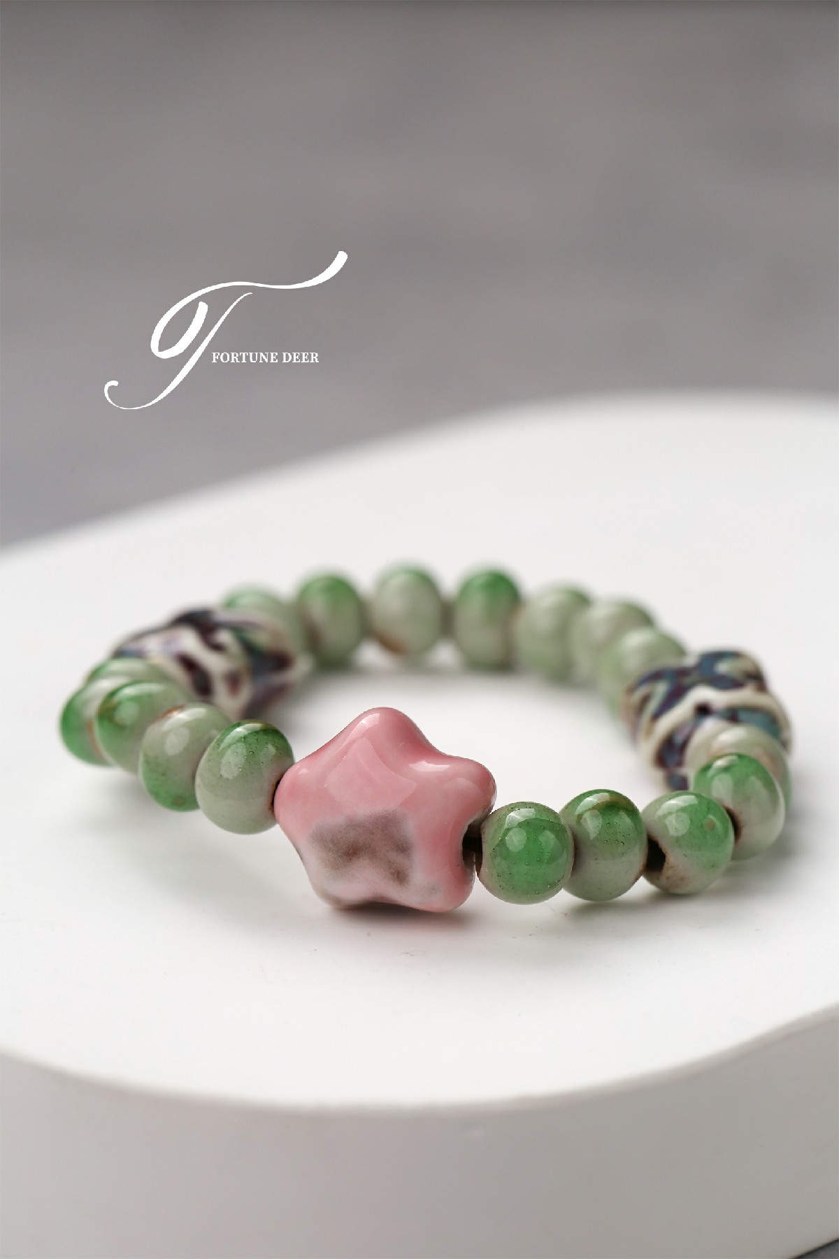 This bracelet embodies the timeless power of nature, with rich green ceramic beads representing the energy of wood and the grounding force of the earth. Delicate pink star accents symbolize transformation and renewal, adding a soft, balancing touch. It connects you with the hidden energies of growth and vitality, inviting balance, strength, and subtle spiritual growth. Wear it to embrace the powerful forces of nature and invite harmony into your life.